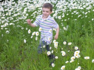 On the slope that leads to the forest is Wildflower Hill. A crop of daisies just came into bloom this month. Jeffrey had fun frolicking about.