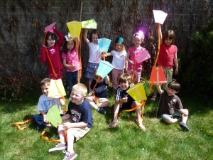 Brian and I made these paper kites using this very clever guide I snipped out of a magazine years ago.  You make three folds in stiff paper, add a wooden skewer and two pieces of tape, and voila — instant kite!  We hid them all in a box and used it as the prize in a treasure hunt.