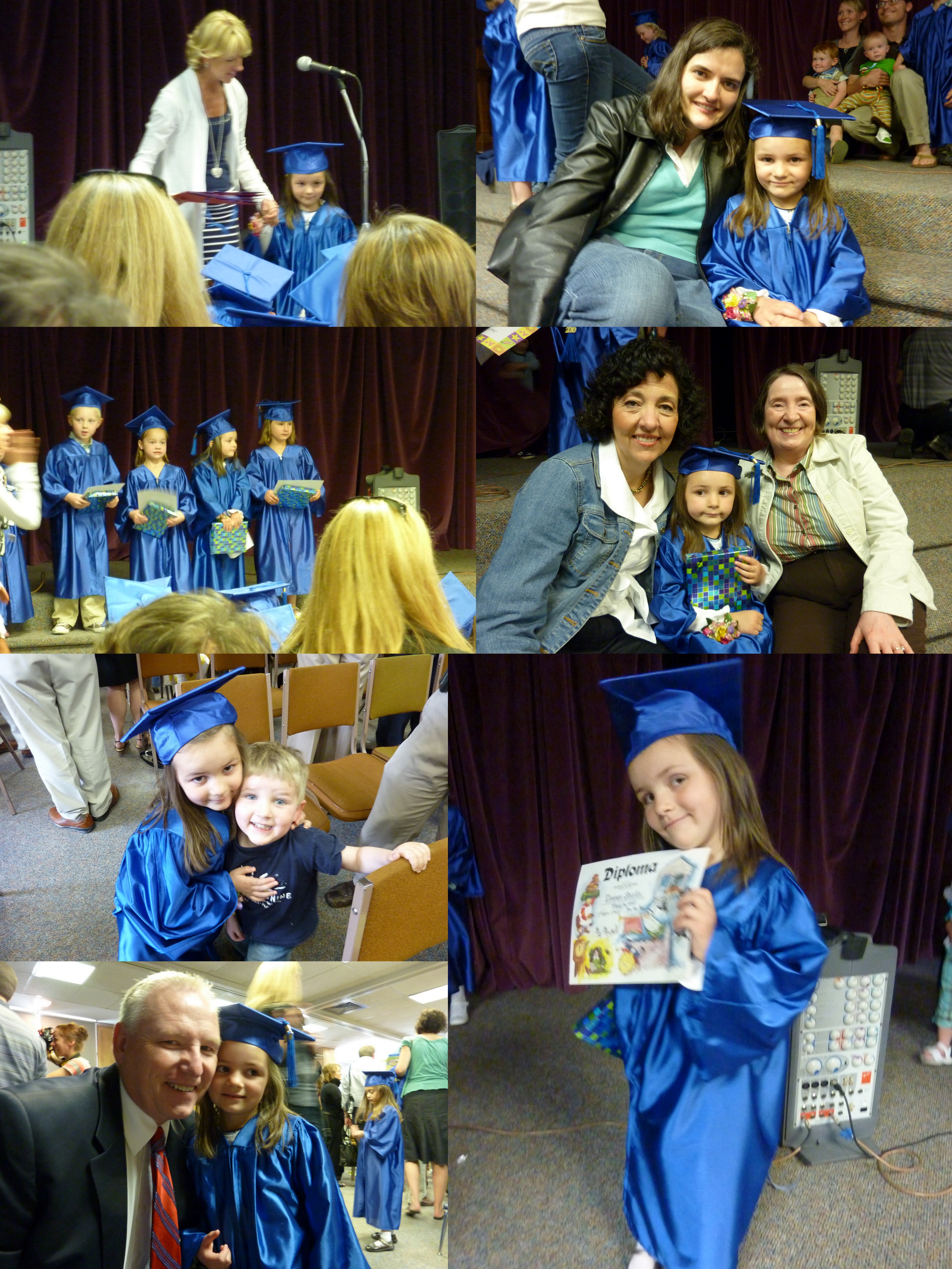 Both grandmas and one grandpa were able to come, as well as her dad and Wimmy.  Note the tiny little corsage on her wrist — that’s from my mom.  She thought she was doing something really funny and clever, but when she went to the florist’s shop for it, she found out that people buy preschool graduation corsages all the time.  Huh.