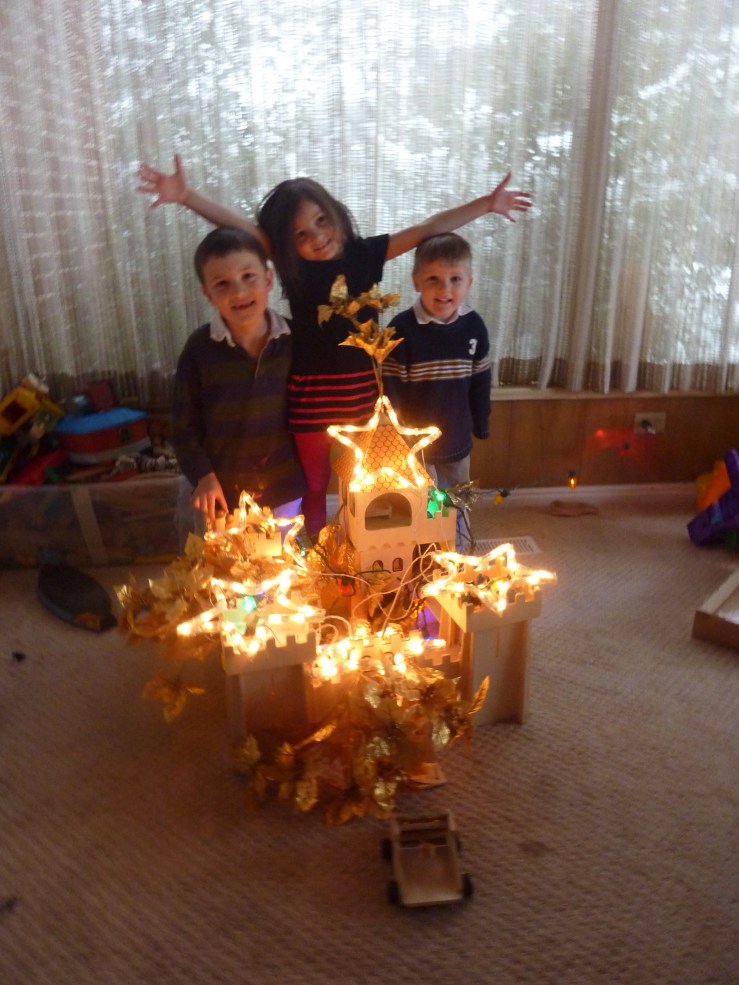 On the first evening, we just set up our tree.  No decorations or anything.  When Brian and I finished this and left to do dishes, the kids decided to Take Matters Into Their Own Hands.  Grabbing up a box of outdoor lights, they went to work on their toy castle: