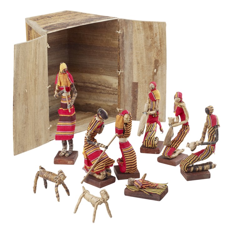 It’s from Uganda.  Our set is just like this, only we have two shepherds, and the stable is made of stamped leather and triangle-shaped.  I think it’s just lovely.  The sheep made of twisted bark are adorable!