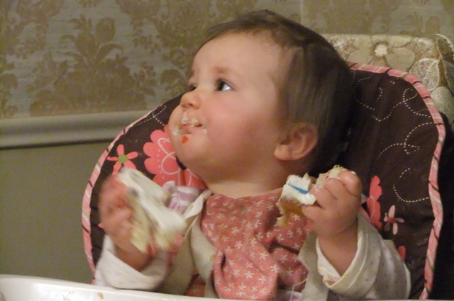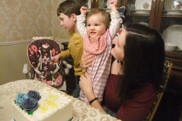 My favorite moment of the evening was how she clapped, cheered, and crowed with the whole family surrounding her — and then how she got a little bashful when we all sang “Happy Birthday.”  She couldn’t have cared less about the cake just then.  Thank goodness big brother William was there to extinguish the candle.