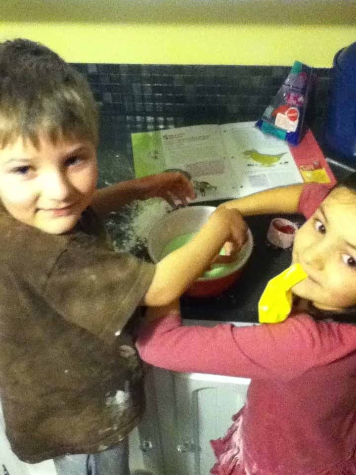 . . . and made the ol’ cornstarch-n-water slime, which the Brownie handbook called “dinosaur snot.” So fun to play with!