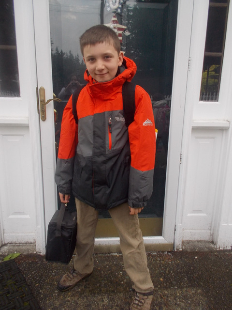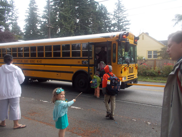 Katie insisted that Brian make her a lunch in a lunch box to carry to the school bus. She was understandably miffed that she wasn’t allowed to board. Fortunately, the sainted grandmother Kathryn is visiting right now, so hugs all around.