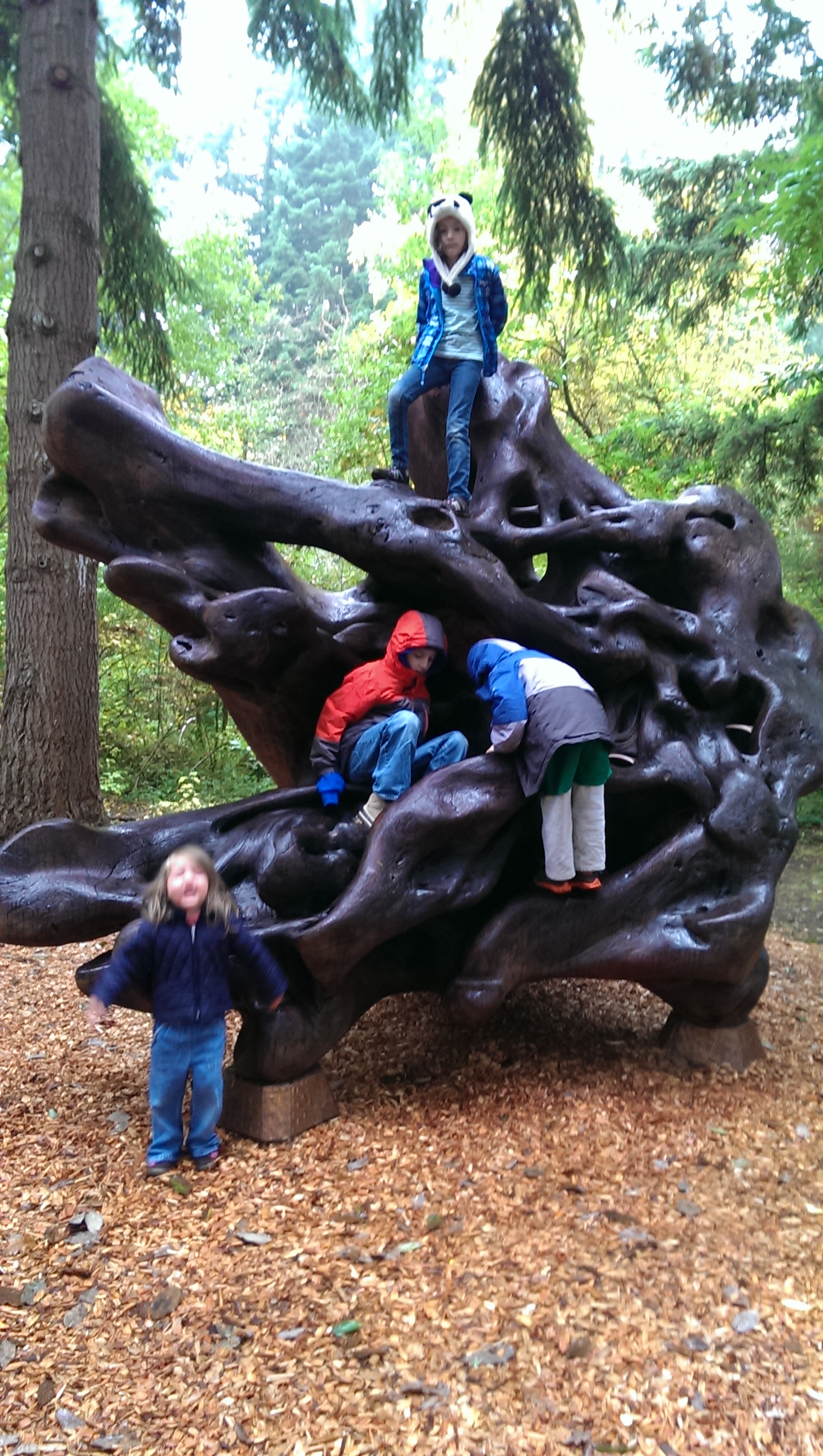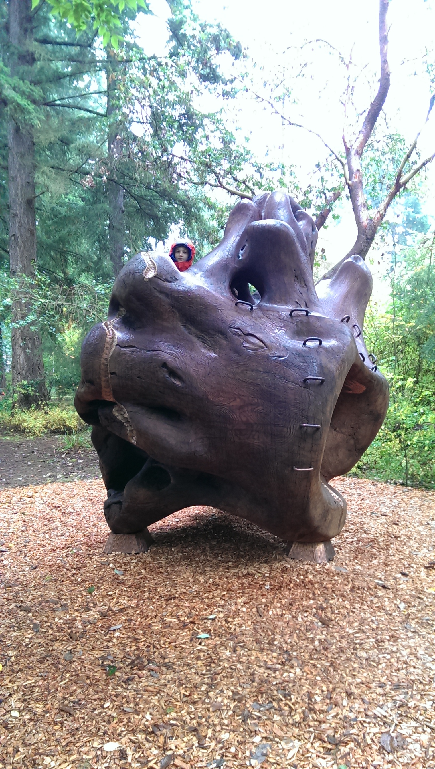 This sculpture was created from the root system of a 1,000 year old Redwood tree. The artist intended it to be “interactive” — he wanted people to be able to climb all over it. There are rods and climbing grips built into the wood; you can see some of them in my pictures.