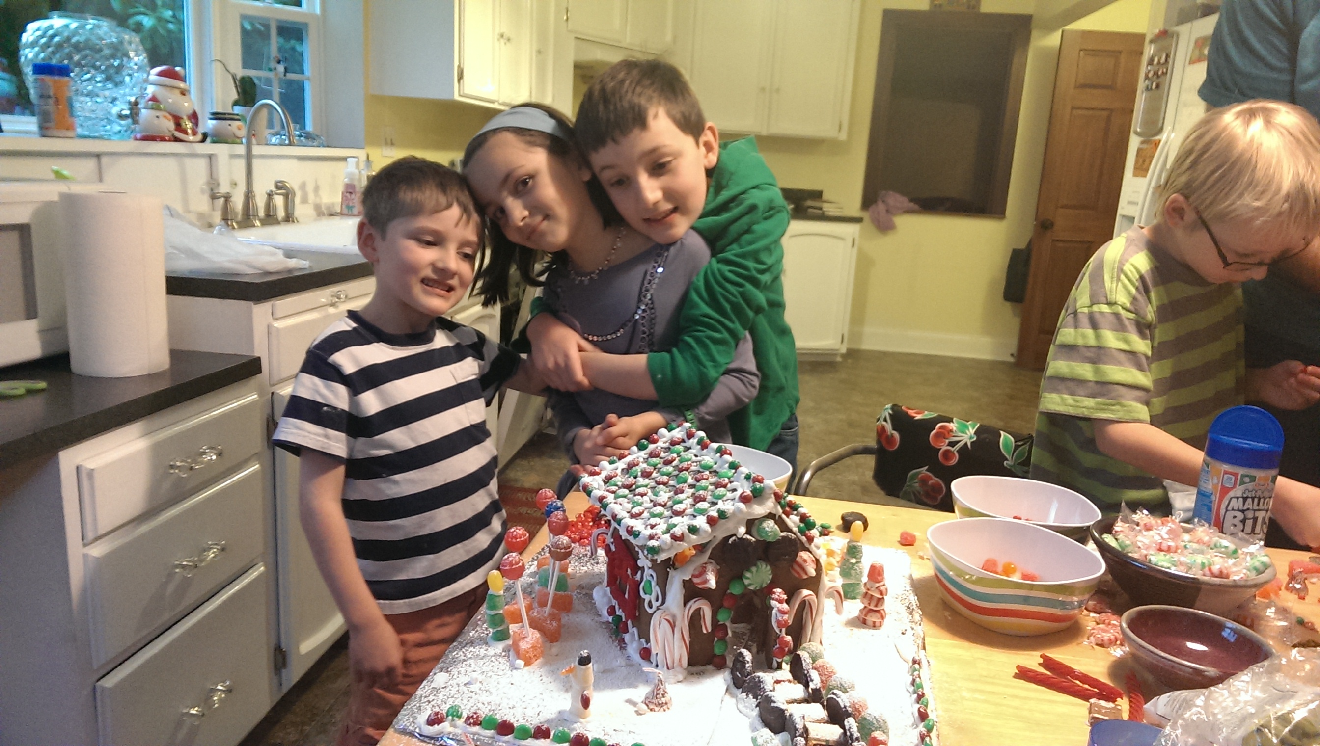 Silliness aside, I’m rather impressed that we managed to make houses this year. I decided to go for 1 big house per family, instead of a little house for each kid. This simplified things immensely . . . until I realized that the dough recipe didn’t make quite enough for two houses. We ended up a roof short.