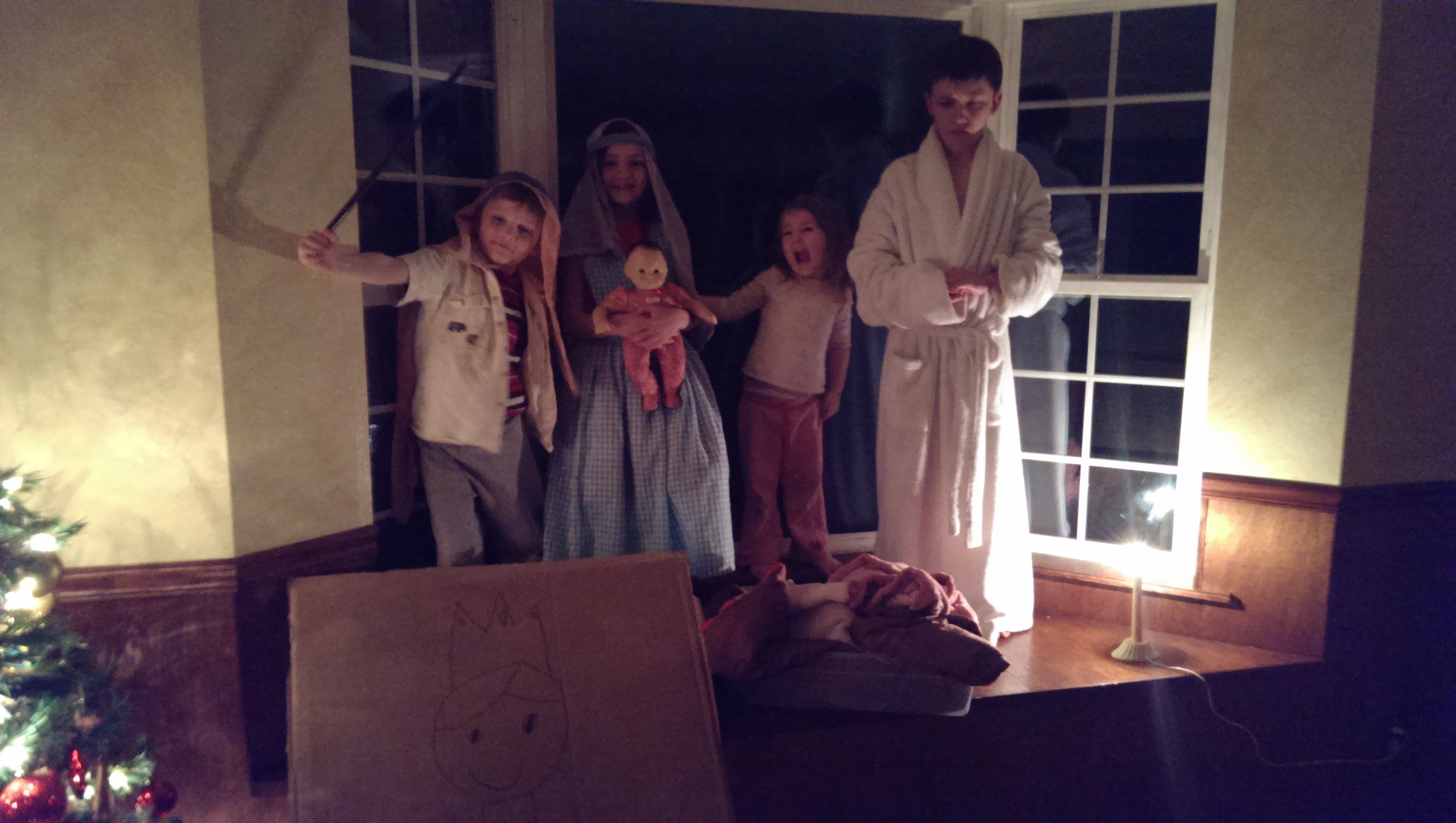Forgive my singing, it’s really loud on the video since I was the one holding the camera. I should have stayed silent, but the kids really wanted that audience participation, and I couldn’t help myself. I case you’re wondering, there’s a Wise Man drawn on that big piece of cardboard. Jeffrey is an angel who likes to bare his bare chest. Katie is . . . herself. Wim is a shepherd, and Eleanor is Everyone Else. And that’s a star made out of Lego, not a crucifix. Got that?