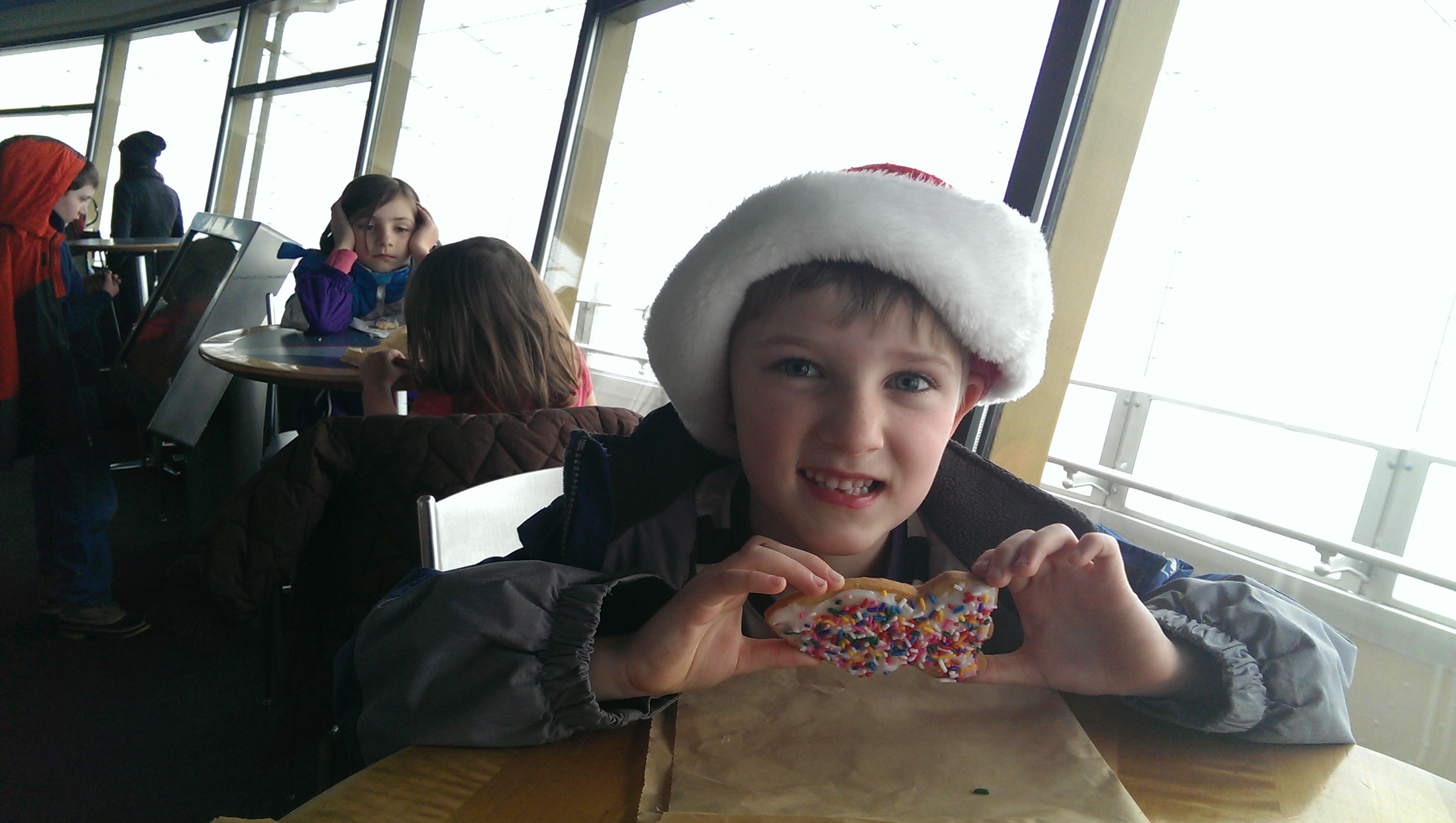 Jeff was worried the whole while that the Needle was going to tip over and fall. (He’s got a point, it does look rather top-heavy.) They explained the careful engineering of the building on the elevator ride to the top, but Jeff hates elevators, too, and spent the whole time covering his ears and just wishing it were all over. Poor guy!
