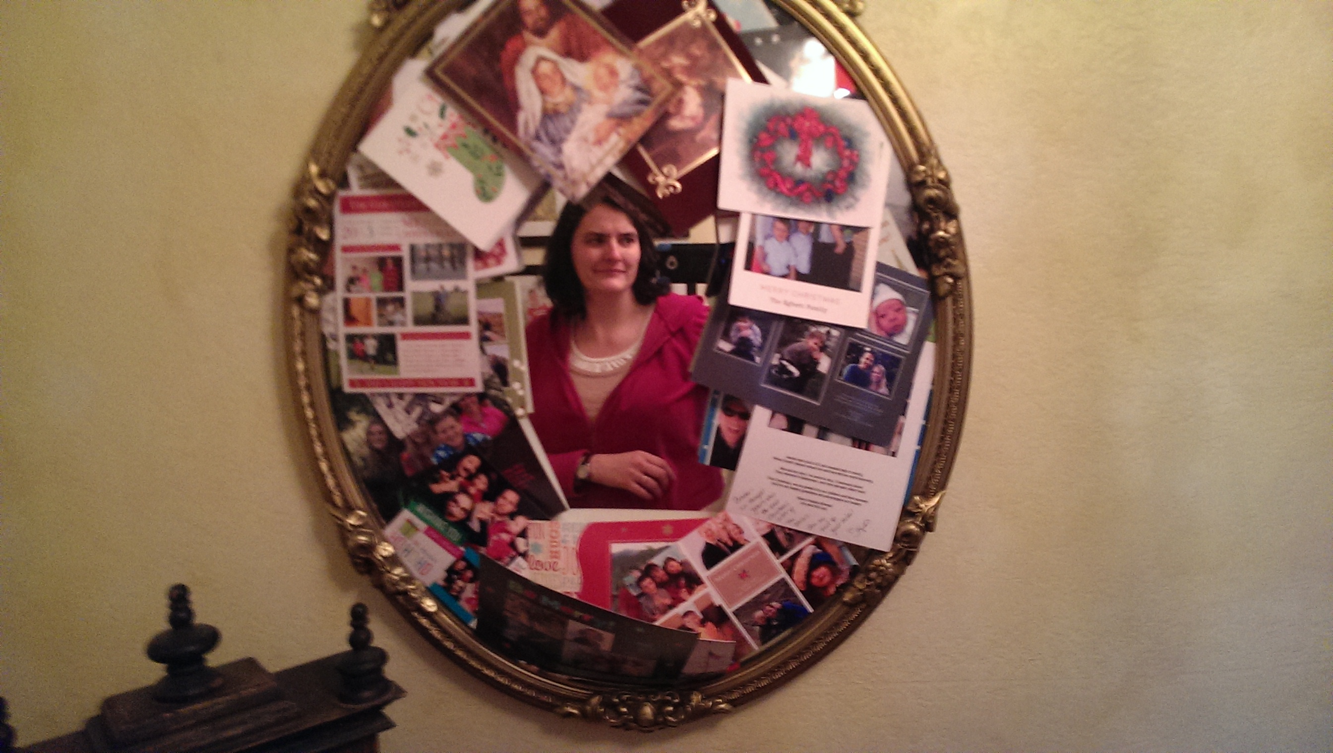 The Sunday before school resumes is our traditional time to take down Christmas decorations. I’m always especially sad to take the Christmas Cards out of the mirror. It’s a big oval mirror that used to belong to Brian’s grandma. She kept it in her front hallway, and now so do we. I love to see how many cards I can wedge into the glass, until my self-reflection completely disappears. There’s a metaphor in there somewhere, I’m sure.