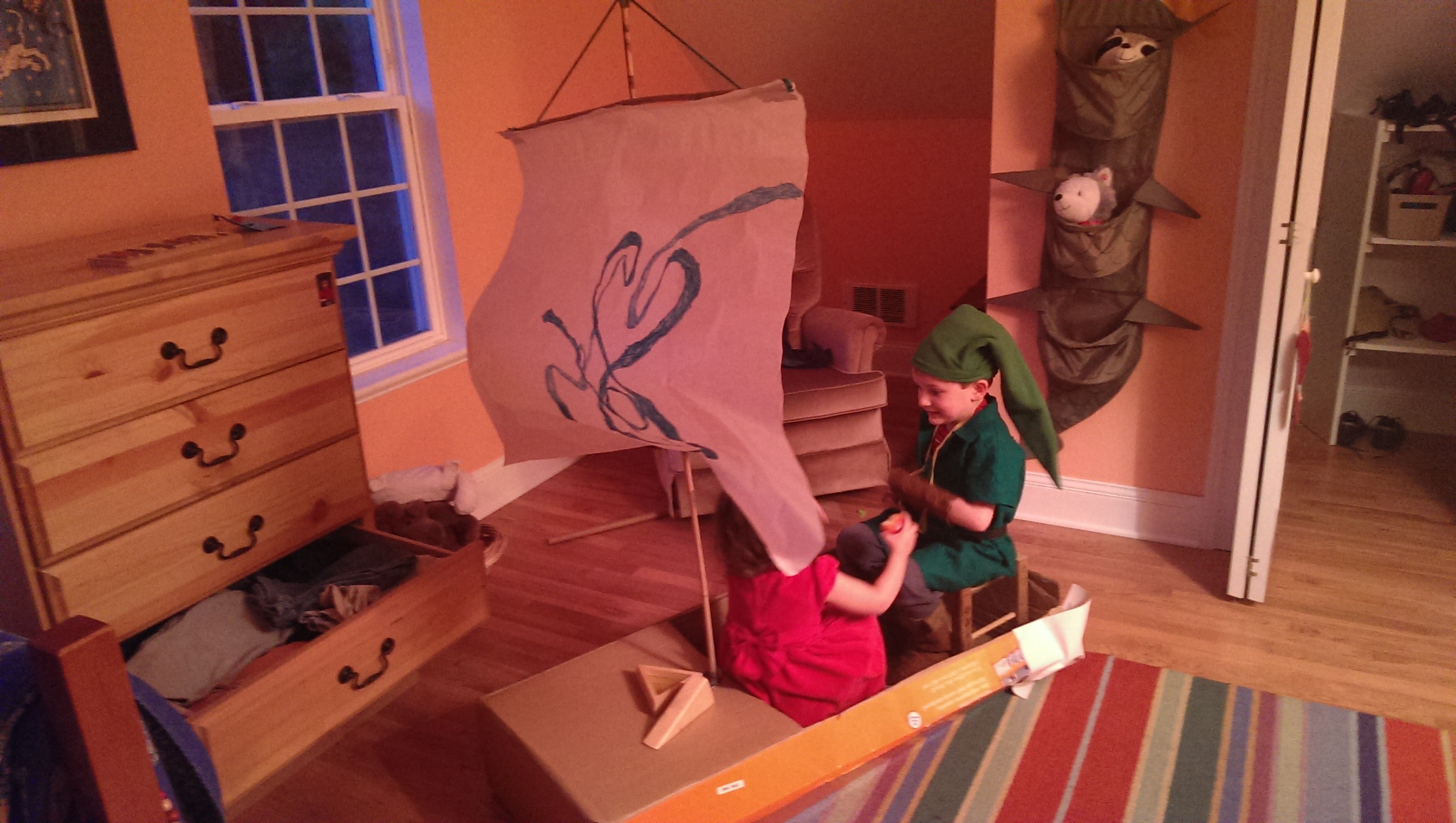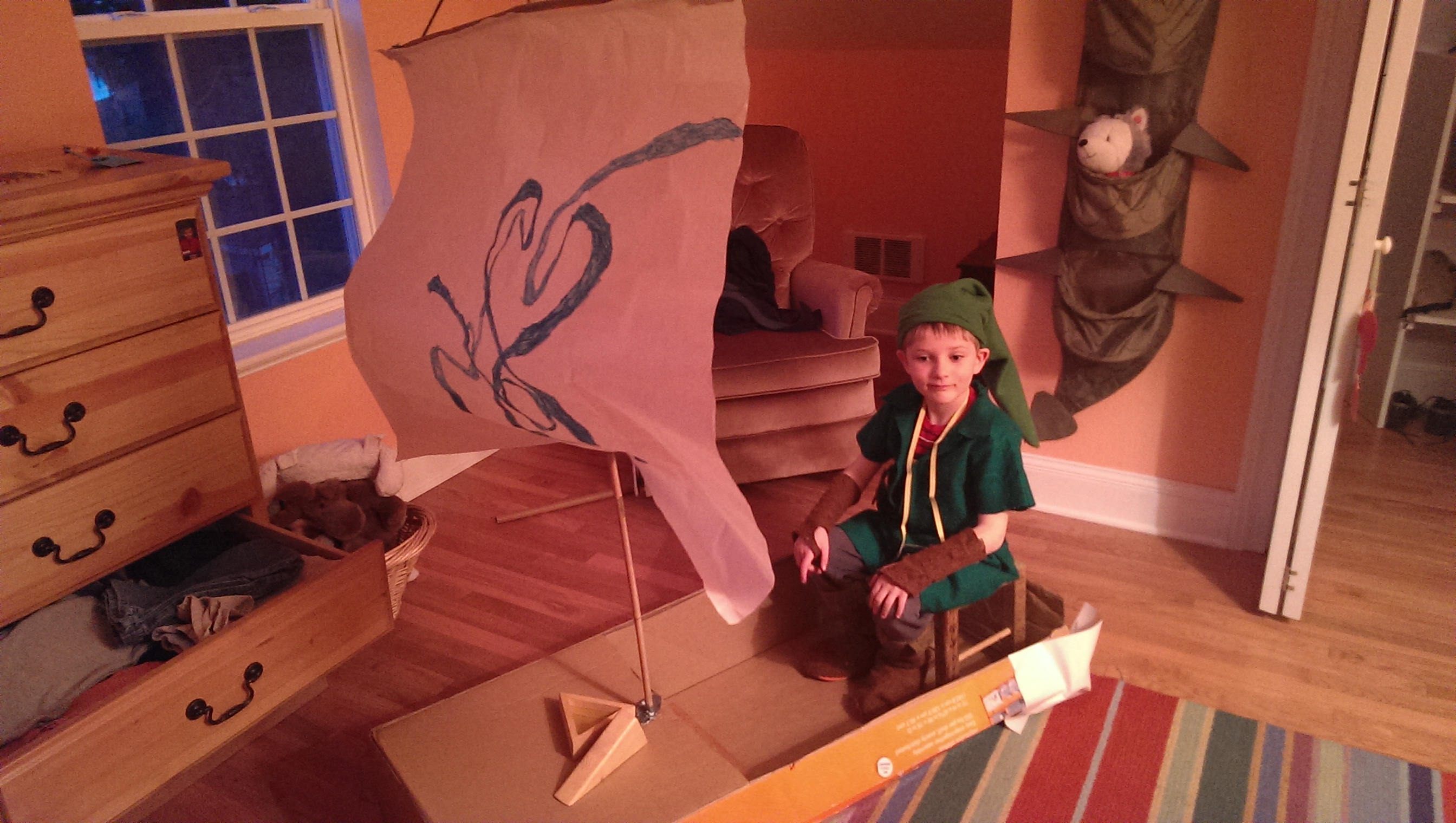 But on this particular Sunday — where I took the pictures of Katie in the red dress — Wim went a step further, dragging a cardboard box up to his room and creating his very own WindWaker boat. I think Brian helped out with the construction of the sail. Thank goodness I happened to have a big sheet of butcher paper laying around, because the results were pretty amazing.