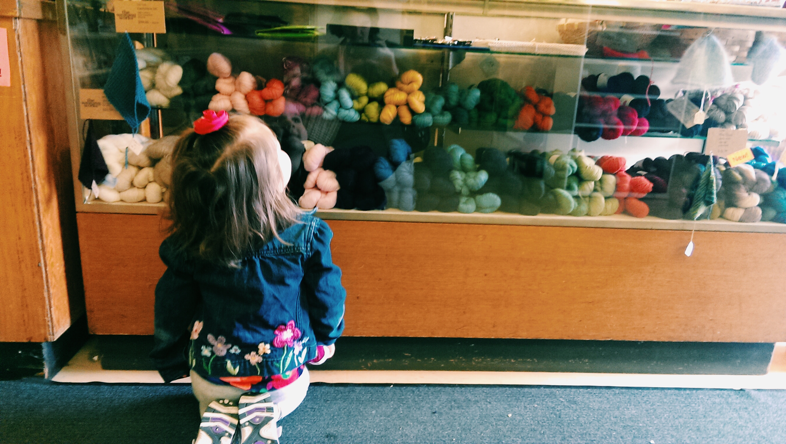These next two are from a knitting store I love called the Weaving Works. Katie has a little purple skein on her thumb that she called her “plum,” from the Little Jack Horner nursery rhyme. I was charmed that she make the connection, but less so when she threw a fit because I wouldn’t buy the “plum” for her to take home.
