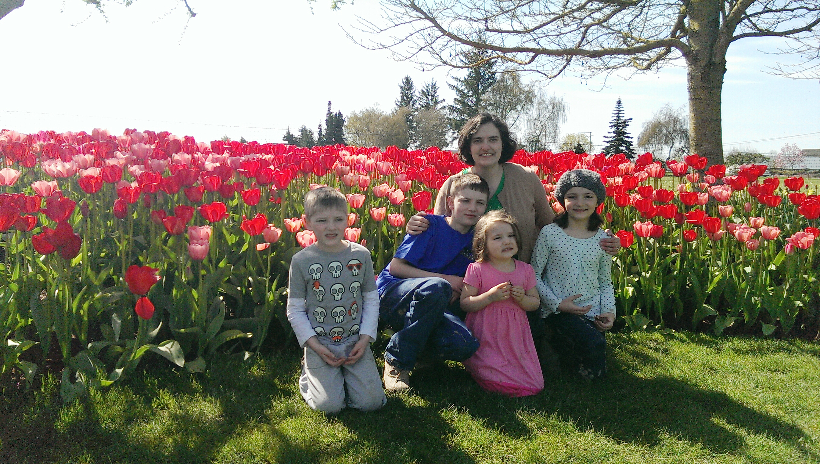 A kindly mother offered to take a picture of all of us. I’ll admit that this is one of the best me-&-them pics I’ve managed to pull off in lo these many days. We are all looking somewhat in the direction of the camera! I look moderately nice! Who’d have thunk it was even possible? Oh, the minor miracles of spring.