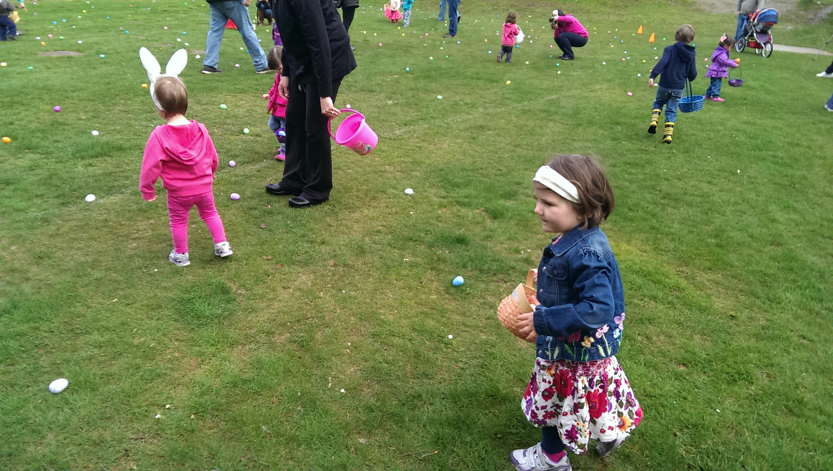 And we went to our usual neighborhood egg hunt. This was the first year that Jeff, Ella and Wim were pretty much self-sufficient. Brian just kept an eye on the older three from the background, while I followed Katie around in the toddler section.