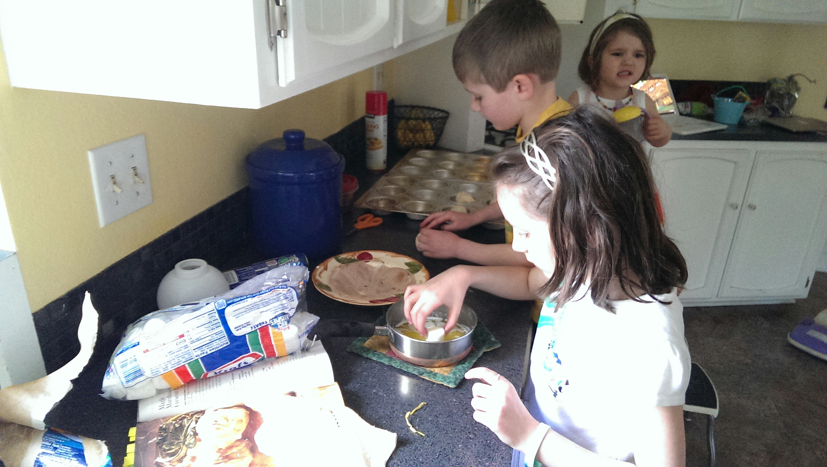And while we only ate leftovers for Easter dinner, we did make a “special” dessert: Resurrection Rolls. This is where you bake a cinnamon-dusted marshmallow inside of a Pillsbury crescent roll. The marshmallow (body) disappears inside of the roll (the “tomb”). Hey, it’s an Internet recipe, and we had the ingredients. Don’t look at me like that. Plus, it’s something Eleanor and Wim could make by themselves, which they thoroughly enjoyed.