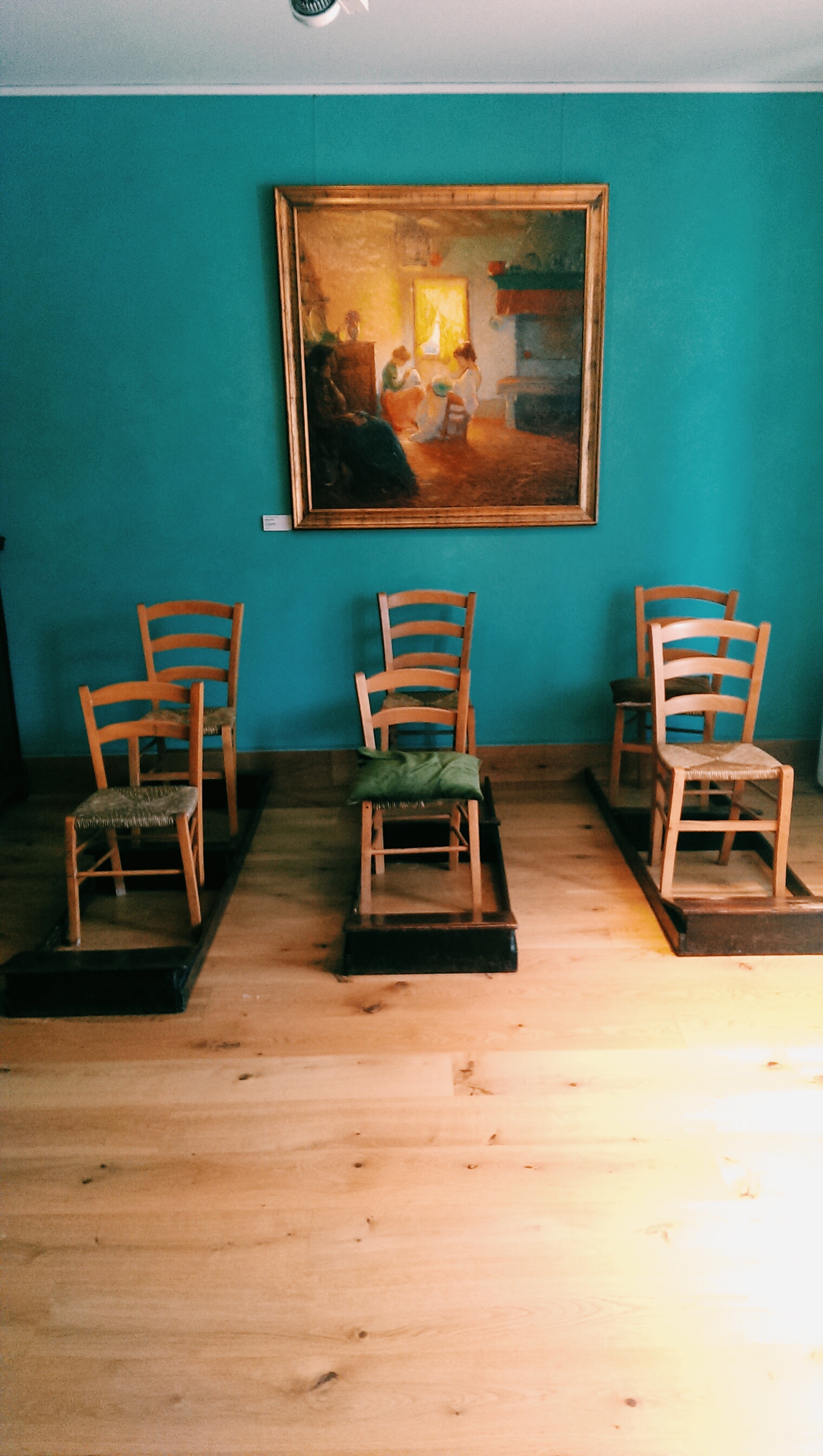 This is a painting of women using lacemakers’ stools, and in front are a collection of stools from the old lacemaking school. I love the wall color, the whole feel of this room.