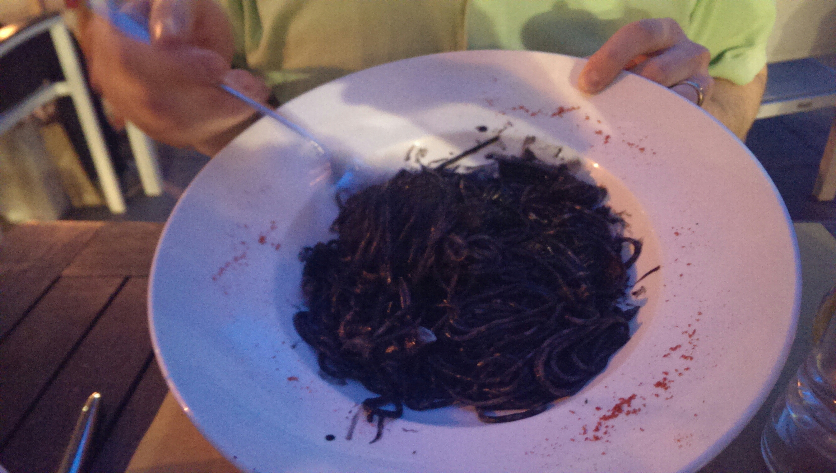 This is a bowl of pasta with a sauce made from squid ink. It turned Brian’s teeth black.