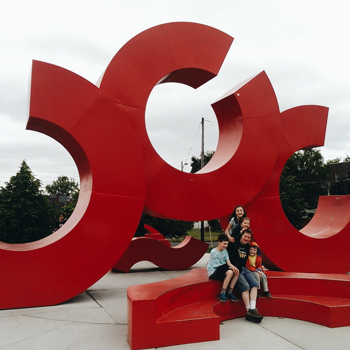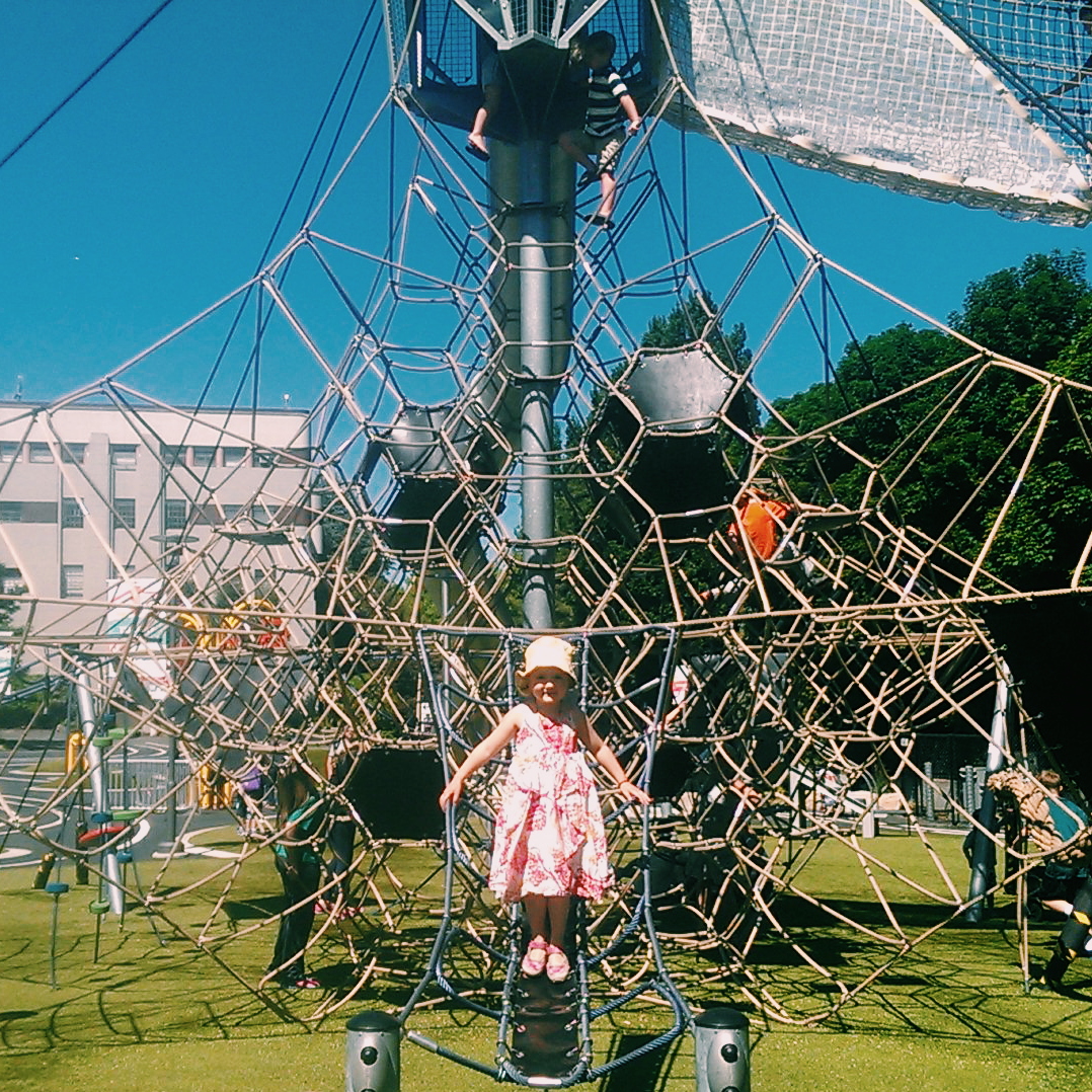 In early June I had the chance to take the kids to the new “Artists at Play” playground at Seattle Center. It’s certainly the tallest playground I’ve ever seen. A giant web of ropes lead to the tops of twenty foot slides.