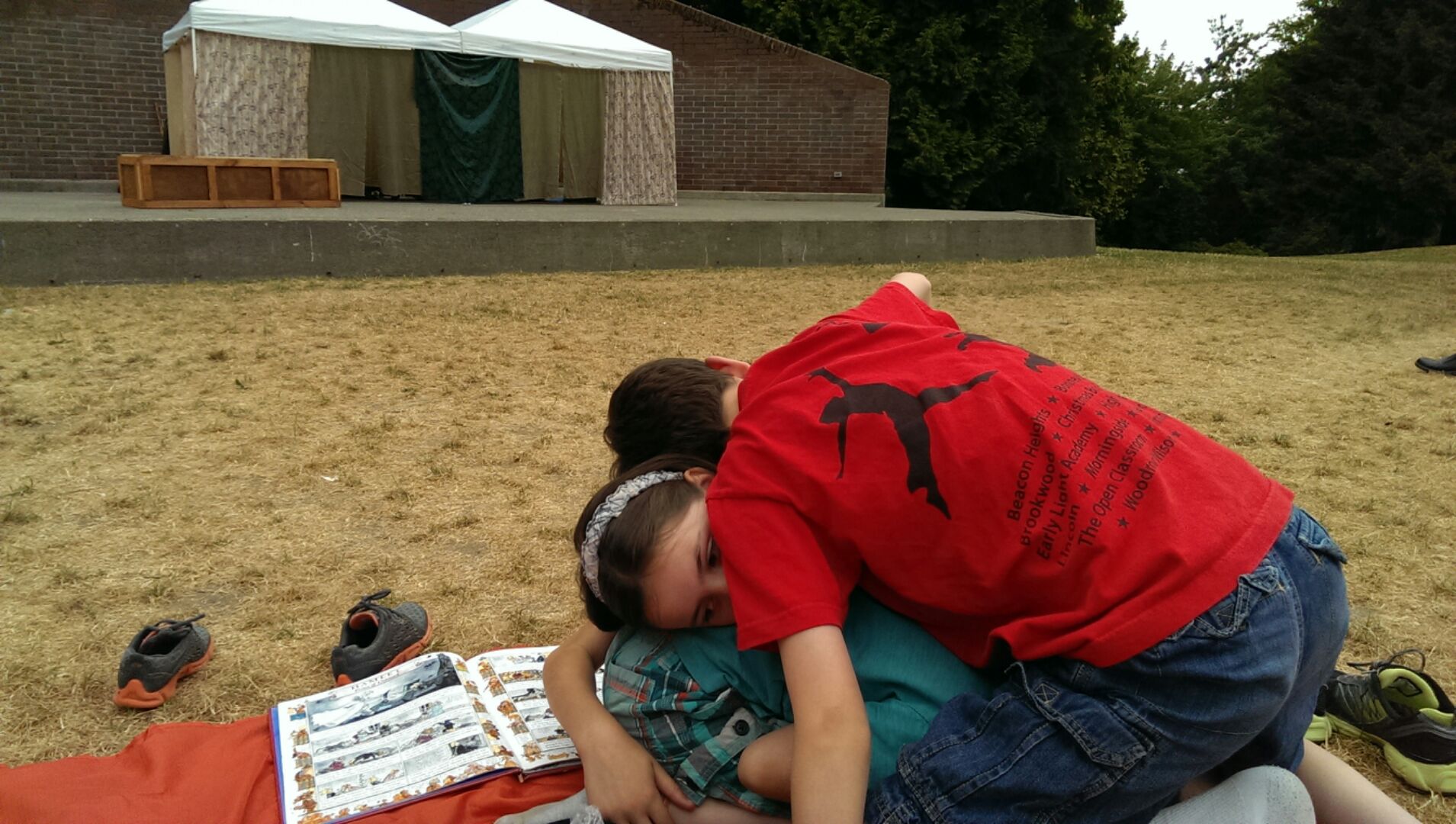 The other half of the camp was spent learning “real stage combat” from the official, certified combat master from the Seattle Shakespeare Company. Our week was spent with Jeff pretending to fake-pull our hair and take a lot of fake punches. The end-of-camp showcase featured Jeff and a classmate “fighting” with the use of some random props. Many fake punches were had.