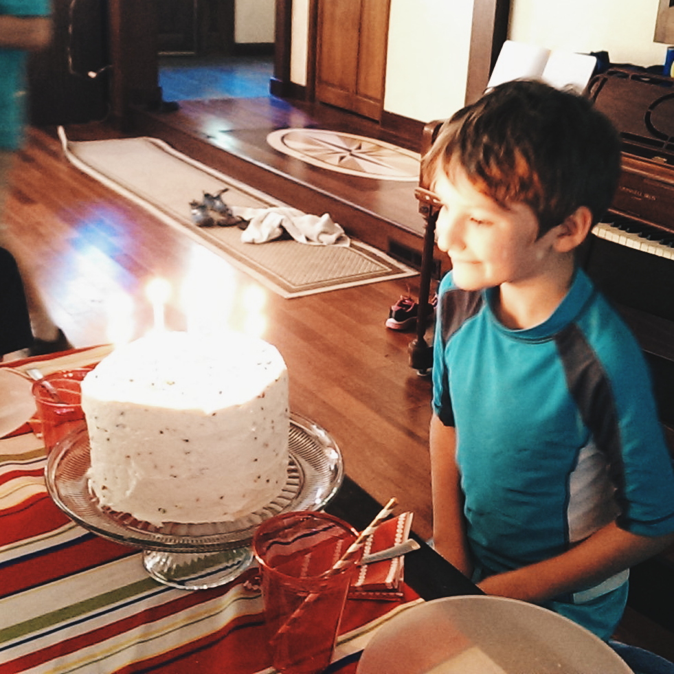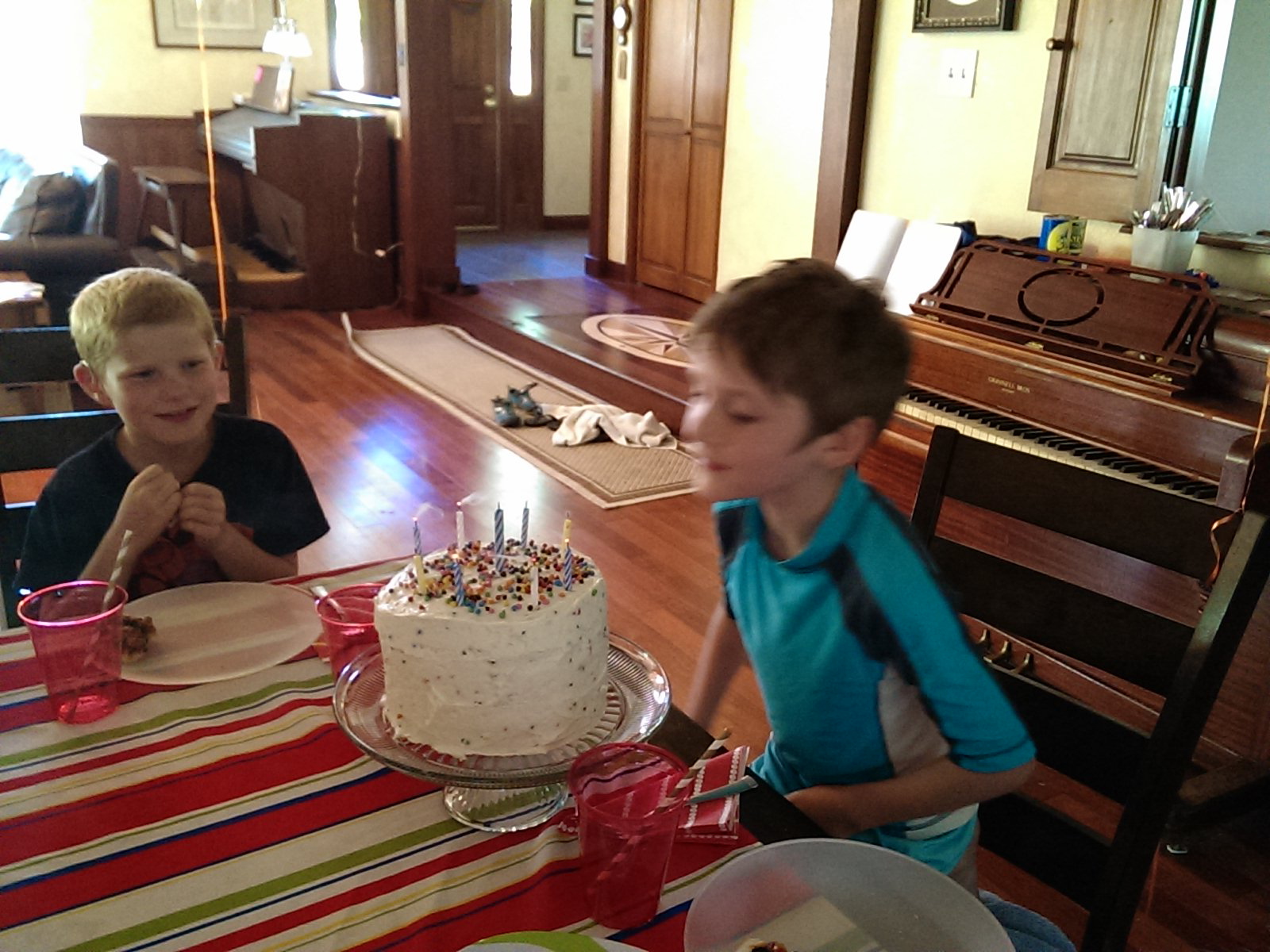 We officially celebrated William’s eighth birthday a week after his birthday. It’s a good thing, too, because if we had celebrated on the day proper, it would have been in the middle of a shivery rainstorm. Since our plans for his party involved lots of outside water play, this was a great thing.