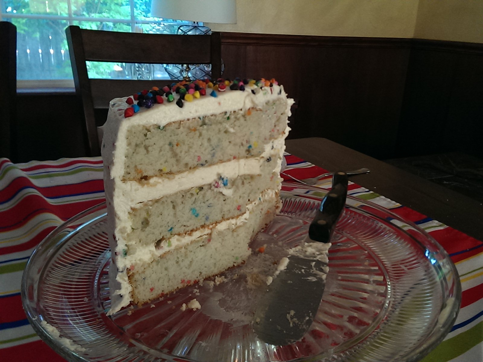 My job was to make the cake. Since the internets are all twitterpated with the reissue of “rainbow chip” Betty Crocker frosting (trust me, this is a thing), I decided to buy a bag of rainbow chips and make my own. I then mixed rainbow sprinkles into cake batter for a homemade “funfetti” cake.