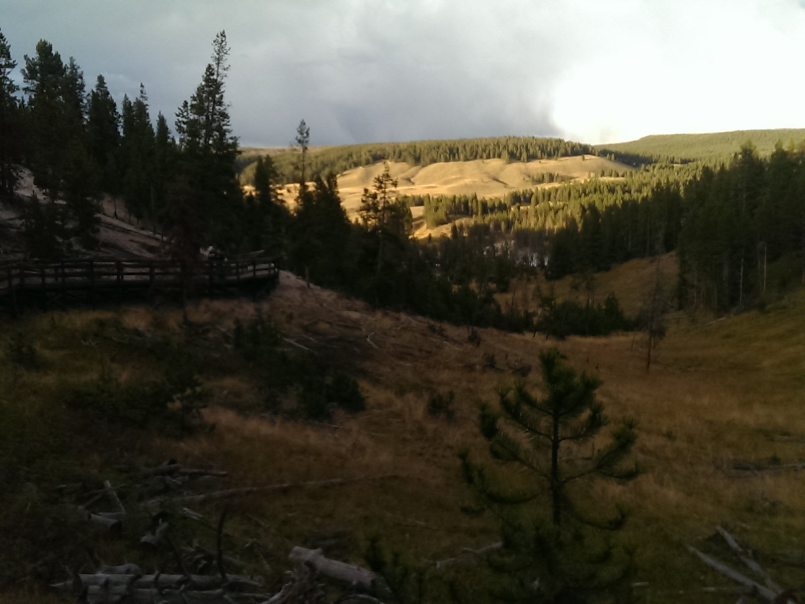 . . . . followed by a drive through Hayden Valley to scout out wildlife. We stopped at a pull-out where a bunch of hard-core animal watchers had telescopes set up. Jeffrey, being who he is, had no problem going up to them, asking what they were looking at, and if he could have a peek. Thanks to his audacity, we all got to have a peek at a black wolf, far across the valley. William, who wrote a report about wolves in 2nd grade and now considers it his favorite animal, was beyond thrilled. I, on the other hand . . . meh. It looked like a dot with ears, even with the telescope.