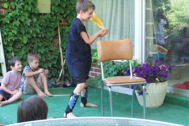 Luckily, my mother-in-law made the generous offer to take Jeffrey to the props seminar later that week, during which Jeff could learn all about the swords, shields, helmets, et. al. to his heart’s content. She also bought him a book about stage combat, which Jeffrey now insists be part of his daily routine.