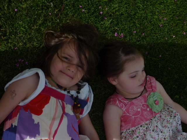 My mother has a “fairy garden” in her backyard, peopled with little knicknacks she finds at thrift stores. June and Abby were playing so sweetly with it: