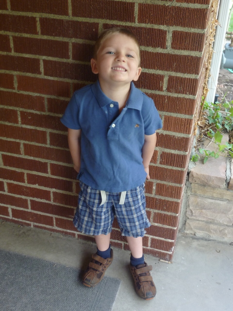 He’s wearing an outfit that his grandmother gave him for his birthday. Little did I know that morning that William had decided that he didn’t like this outfit, and snipped the edges of the shorts and the sleeves of the shirt with scissors. I didn’t notice the raggedy, ruffly hems until after lunch that day.
