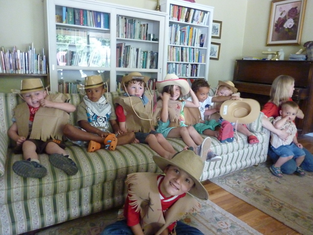 We made vests out of paper bags! (Brian was the one who figured out how to turn the bags inside out without tearing them. Because what kind of self-respecting cowboy runs around with “Freshness Guarantee” and a giant picture of a peach on his back?
