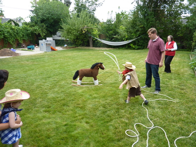 We lassoed a rocking horse! And later ran around with squirt guns!