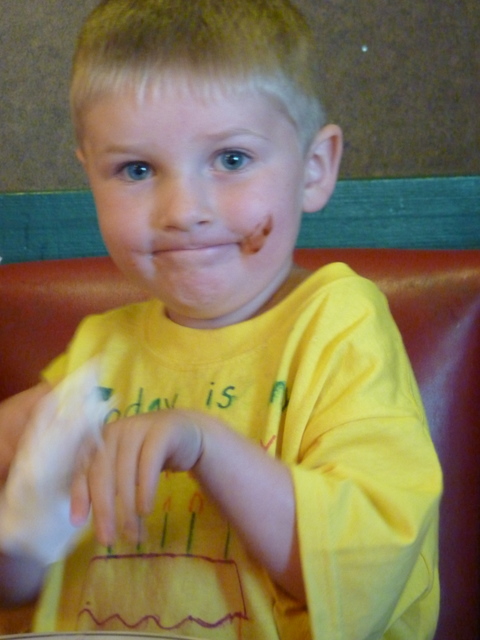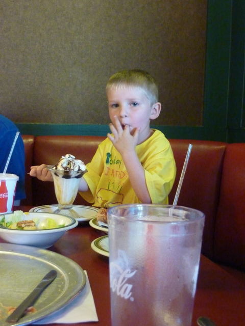 His grandparents took him bowling, and at dinnertime he even was serenaded at the Pizza Factory, and as a reward for enduring that travail, he was given an ice cream sundae. (Ah, the Pizza Factory. You gotta admire the restaurant that admits up-front that its food is not prepared by humans.)